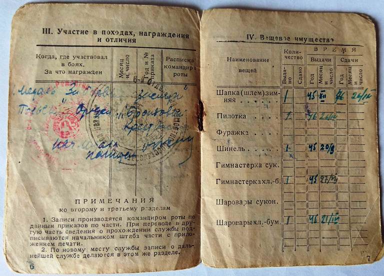 Ранения и контузии: легко ранен в ногу в октябре 1943 г., контужен во время Кировоградской наступательной операции.